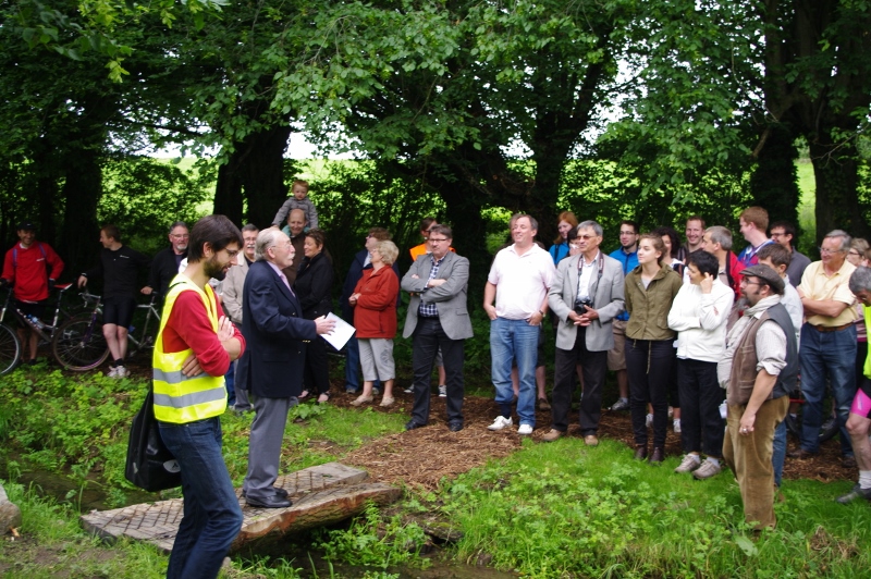 Afin de présenter les édifices restaurés au grand public, une randonnée cycliste transfrontalière a été organisée ce dimanche 30 juin sur le territoire de la Fagne de Solre transfrontalière. Le soleil aidant, pas moins de 34 cyclistes étaient présents au théâtre de verdure à Lez-Fontaine, où le départ fut donné à 9h30. Encadrés par les organisateurs du Parc naturel régional de l’Avesnois (F) et du GAL de la Botte du Hainaut (B) ainsi que par des bénévoles, les cyclistes se sont arrêtés sur quatre chantiers : la fontaine « Couillette » à Lez-Fontaine (F), la fontaine Saint-Maurice à Dimechaux (F), la chapelle de Bon-Secours à Grandrieu (B) et le portail du cimetière à Leval-Chaudeville (B). A chacun de ces arrêts, différents intervenants ont pris la parole : les élus, les formateurs et architectes du chantier ainsi que les ouvriers communaux ayant participé aux chantiers. Ceux-ci ont pu expliquer aux amateurs du patrimoine les travaux menés sur les édifices et les précautions à prendre dans le futur afin de garantir la pérennité de ces édifices restaurés. Des haltes entre chaque édifice ont également été l’occasion d’apprécier les caractéristiques paysagères de la Fagne de Solre transfrontalière ainsi que les caractéristiques architecturales des bâtiments ruraux aperçus tout au long de la ballade.