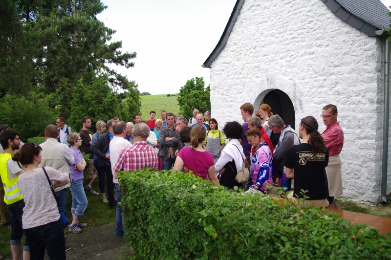 Le 30 juin 2013 – Randonnée cycliste organisée dans le cadre de l’inauguration des chantiers de formation Depuis 2010, les partenaires du projet INTERREG IVTrans-formation du patrimoine organisent des chantiers de formation sur l’entretien et la restauration du bâti ancien destinés aux agents communaux. Encadrés par un formateur, ils sont initiés aux diverses techniques propres à la restauration du petit patrimoine populaire : maçonnerie de moellons de pierre bleue, maçonnerie au mortier de chaux naturelle, taille de la pierre, badigeon etc. Depuis le début du projet, 11 édifices ont pu être restaurés grâce à ces chantiers transfrontaliers.