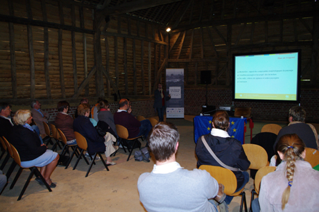 La matinée s’est déroulée dans un premier temps dans la grange en pan de bois et torchis de la Maison du Bocage de Sains-du-nord (F) où les invités ont pu apprécier les interventions succinctes de Anne BRAQUET, paysagiste au Conseil d’Architecture d’Urbanisme et de l’Environnement du Nord, et de Dimitri BELAYEW, géographe et maître assistant à la Haute école Léonard de Vinci de Louvain-la-Neuve. Ils ont exposé et remis dans le contexte l’évolution du paysage de notre territoire en confrontant le côté wallon et le côté français. En deuxième partie de matinée et en première partie d’après midi, les élus et acteurs ont été invité à un tour-bus qui a permis, en parcourant le territoire, d’être sensibiliser au bâti comme élément constitutif du paysage mais également à son impact dans l’évolution des paysages ruraux. Pour ce faire des points d’observation avait été choisis pour mettre en avant les propos et d’analyser différents sites.