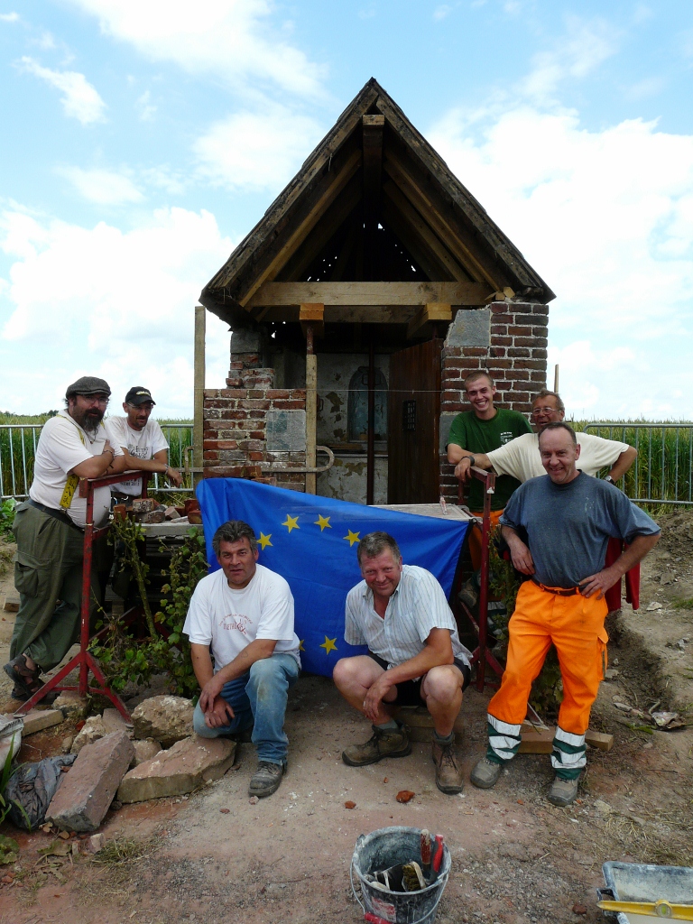 Dans le cadre du projet Interreg IV franco-wallon Trans-formation du patrimoine, plusieurs communes ont été retenues pour accueillir des chantiers de restauration de leur patrimoine bâti. Après les chantiers des fontaines de Dimechaux, Lez-Fontaine et Bettrechies, proposés à des agents municipaux, c’est désormais au tour de Hon-Hergies d’accueillir un chantier de formation aux techniques d’entretien et de restauration du bâti ancien, pour la réfection de la chapelle de la Toureille. Les recherches menées ont montré qu’une chapelle existait à cet emplacement depuis le XIIIe siècle. Si la chapelle actuelle date du 1er¼ du XIXesiècle, elle a vraisemblablement été bâtie avec les matériaux plus anciens, comme en témoigne les départs de wambergues, retournés et réemployés en appuis et linteaux de fenêtre. En bref, cette modeste chapelle cache encore bien des secrets… D’un point de vue technique, l’édifice était mal en point, et les rejointoiements antérieurs au ciment n’ont fait qu’aggraver les choses. Entre le 5 juin et le 11 juillet 2012, tous les mardis et mercredis, 4 agents techniques des communes de Bavay, Colleret et Hon-Hergies, en formation, ont démontés, puis remontés, la façade avant et une partie du mur Ouest. Une reprise de fondation fut nécessaire pour assurer une restauration durable dans le temps. Les agents ont été formés au respect de l’appareillage traditionnel « à la française », à la confection d’un linteau cintré en brique, à la pose et au jointoiement au mortier de chaux… Ils ont aussi appris à doser respect du bâti ancien et utilisation de techniques modernes : pour la reprise de la fondation, une semelle de béton est tout à fait adaptée ; en revanche, il était important de retrouver le mélange de joint originel, pour garder une homogénéité entre les parties restaurées et les parties en bon état de conservation. II a donc fallu composer un mortier cendré du XIXe siècle, et introduire de la cendre de bois dans le mortier à la chaux ! Deux agents belges de la commune de Doische, partenaire du projet InterregTrans-formation du patrimoine, ont aidés les stagiaires français pendant 2 jours, et se sont familiarisés avec le « gros » sable utilisé en France. Leur intervention a donné un sacré coup de truelle au chantier ! Aujourd’hui, aux travaux de maçonneries doivent succéder les travaux de restauration de la couverture et des menuiseries, par la commune et avec l’aide de la Fondation du Patrimoine.